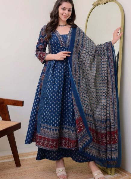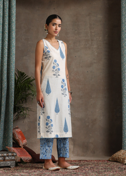 Off-White & Blue Printed Notch Neck Schiffli Work Cotton A-Line Kurta & Trouser