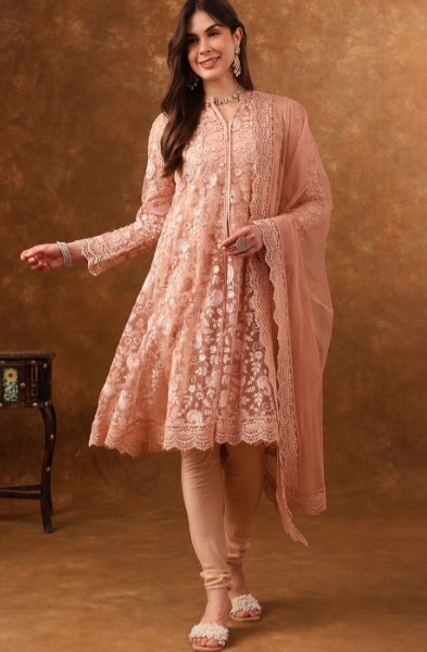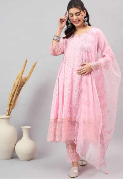 Pink Floral Embroidered Sequined Anarkali Kurta With Churidar & With Dupatta Inner