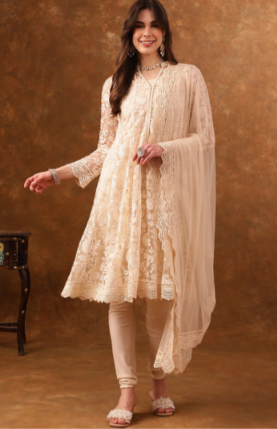 Off White Ethnic Embroidered Anarkali Kurta with Churidar & Dupatta With Inner